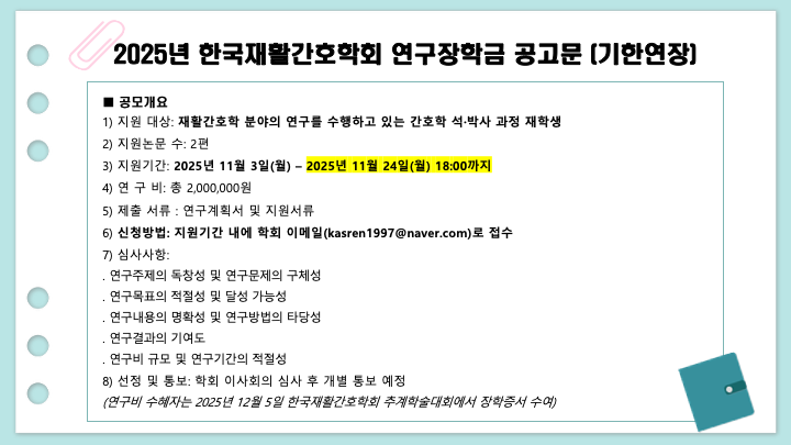 2025년 한국재활간호학회 연구장학금 공고문 (기한 연장 공지)
