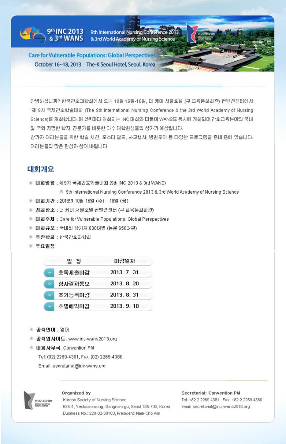 o 대회명칭 : 제9치 국제간호학술대회 (9th INC 2013 & 3rd WANS))